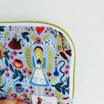 Conjunto formado por llavero de tela, bolso de mano acolchado con abertura lateral y monedero tarjetero con dos bolsillos y cremallera.