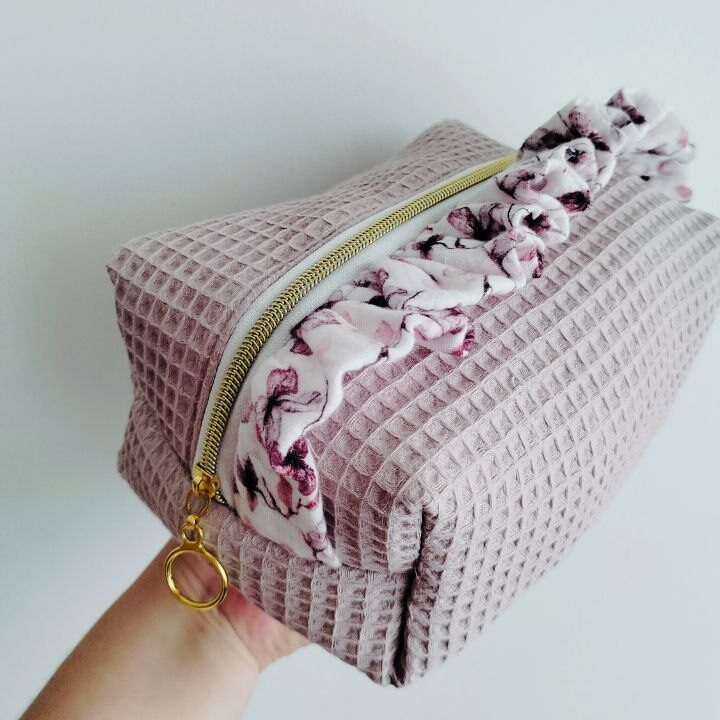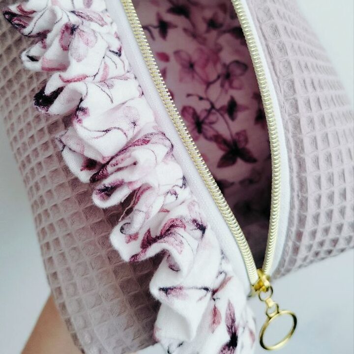El neceser rectangular es ideal para llevar esas cosas que necesitan un espacio único. Tiene unas medidas aproximadas de 22 largo por 12 ancho por 10 alto. Por fuera es de waffle y por dentro de tela estampada. Lleva un volante hecho con la misma tela del volante.