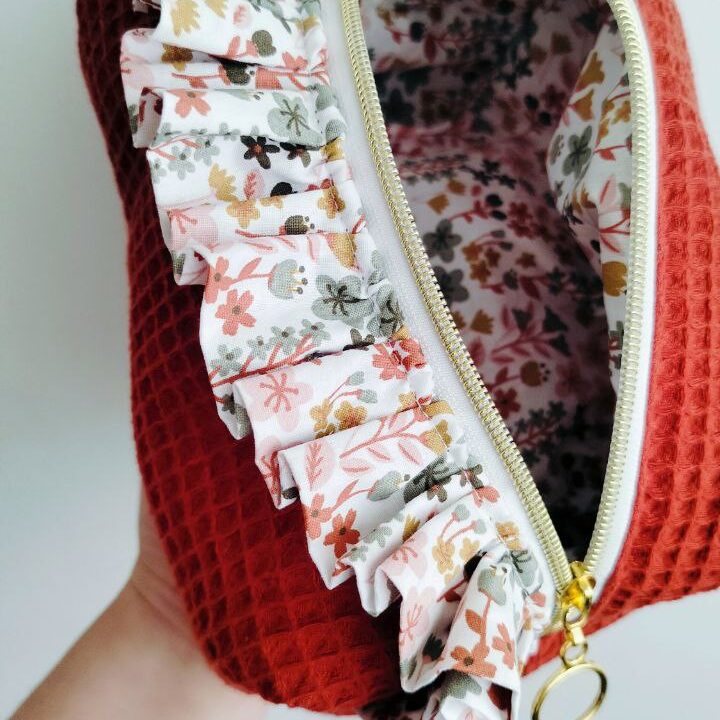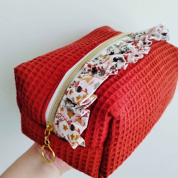 El neceser rectangular es ideal para llevar esas cosas que necesitan un espacio único. Tiene unas medidas aproximadas de 22 largo por 12 ancho por 10 alto. Por fuera es de waffle y por dentro de tela estampada. Lleva un volante hecho con la misma tela del volante.