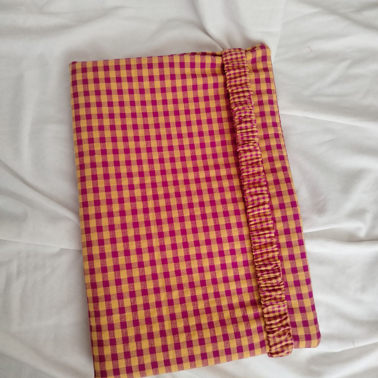 En el interior tiene un bolsillo o estuche cerrado con cremallera. Tiene dos bolillos grandes a cada lado , donde cabe un ordenador portátil (aportar tamaño del portátil para hacerlo a medida). Tiene un  bolsillo delanteros en el lateral derecho para meter folios o cuadernos de tamaño A4. Se cierra con una goma ancha a juego con la tela elegida.
