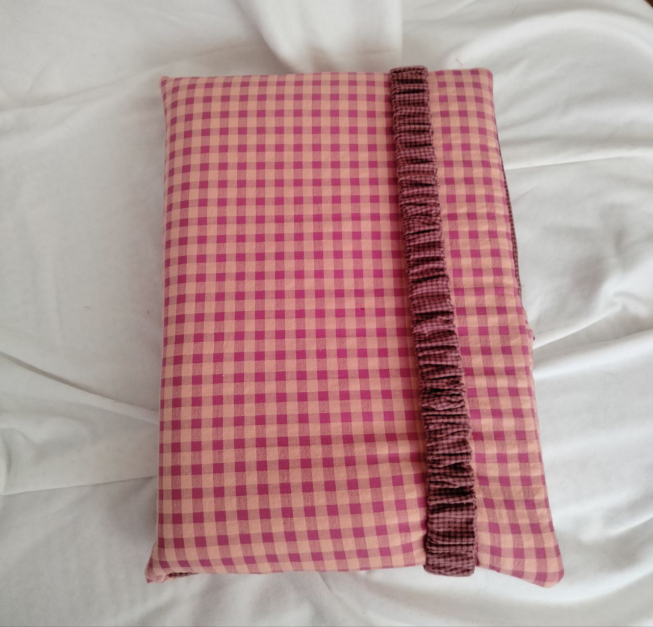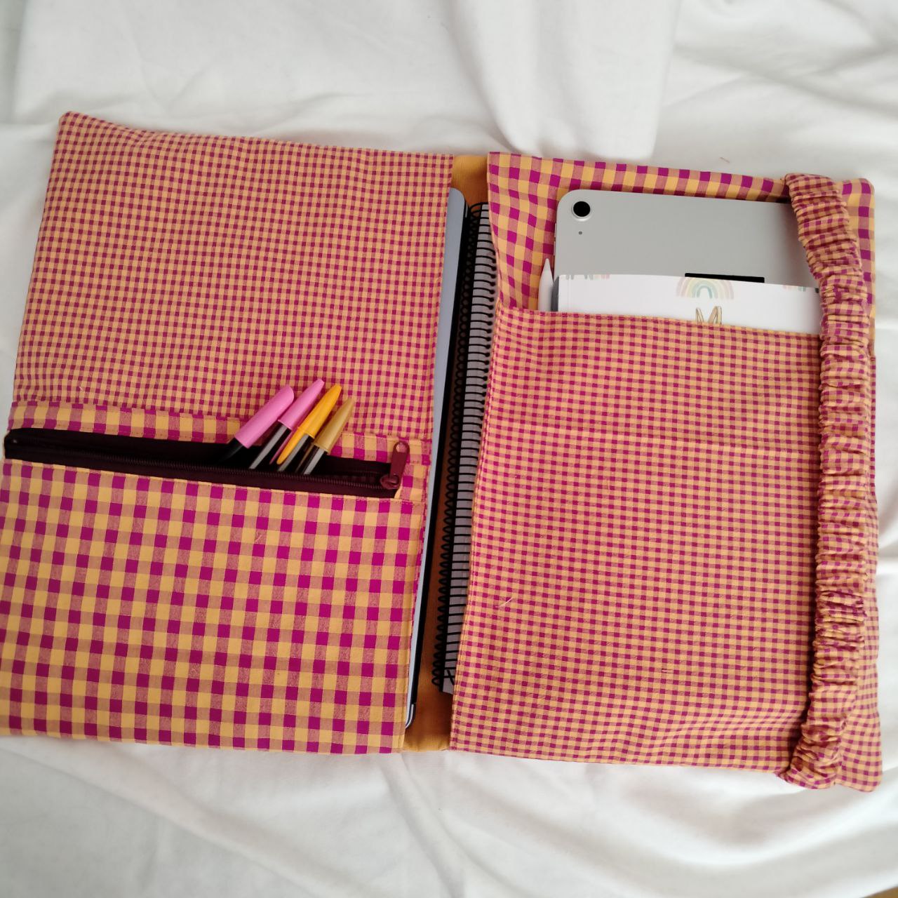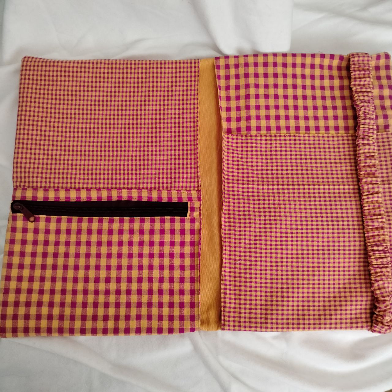 En el interior tiene un bolsillo o estuche cerrado con cremallera. Tiene dos bolillos grandes a cada lado , donde cabe un ordenador portátil (aportar tamaño del portátil para hacerlo a medida). Tiene un bolsillo delanteros en el lateral derecho para meter folios o cuadernos de tamaño A4. Se cierra con una goma ancha a juego con la tela elegida.